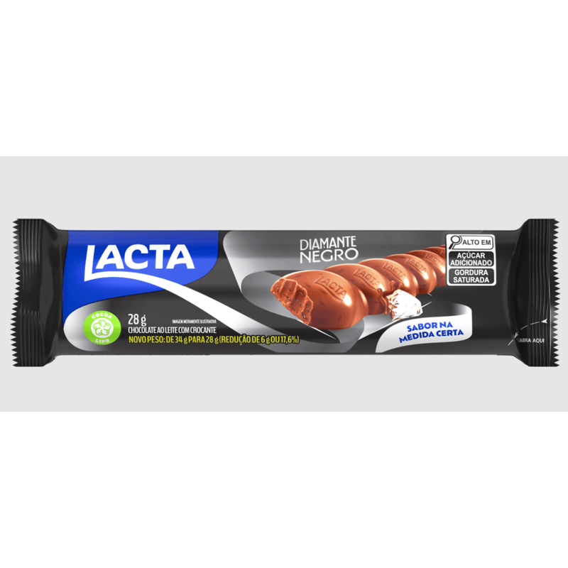 A icônica e inconfundível Barra de Chocolate ao Leite Lacta Diamante Negro 28g traz a combinação perfeita entre chocolate ao leite Lacta e pedacinhos crocantes de açúcar e castanha junto com seu formato exclusivo. Seu crocante é bem fininho e foi desenhado para quebrar com facilidade durante a mordida. É ele quem dá a textura única e exclusiva do Diamante Negro fazendo com que cada pedacinho seja ainda mais delicioso.