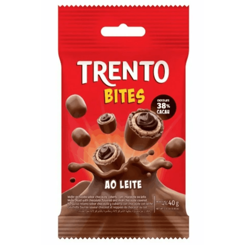 Wafer recheado sabor chocolate coberto com chocolate ao leite 38% cacau.Muito mais sabor em cada mordida! Trento Bites Ao Leite é um wafer recheado sabor chocolate coberto com chocolate ao leite 38% cacau. Todo o sabor de Trento em deliciosas pequenas porções! Experimente!