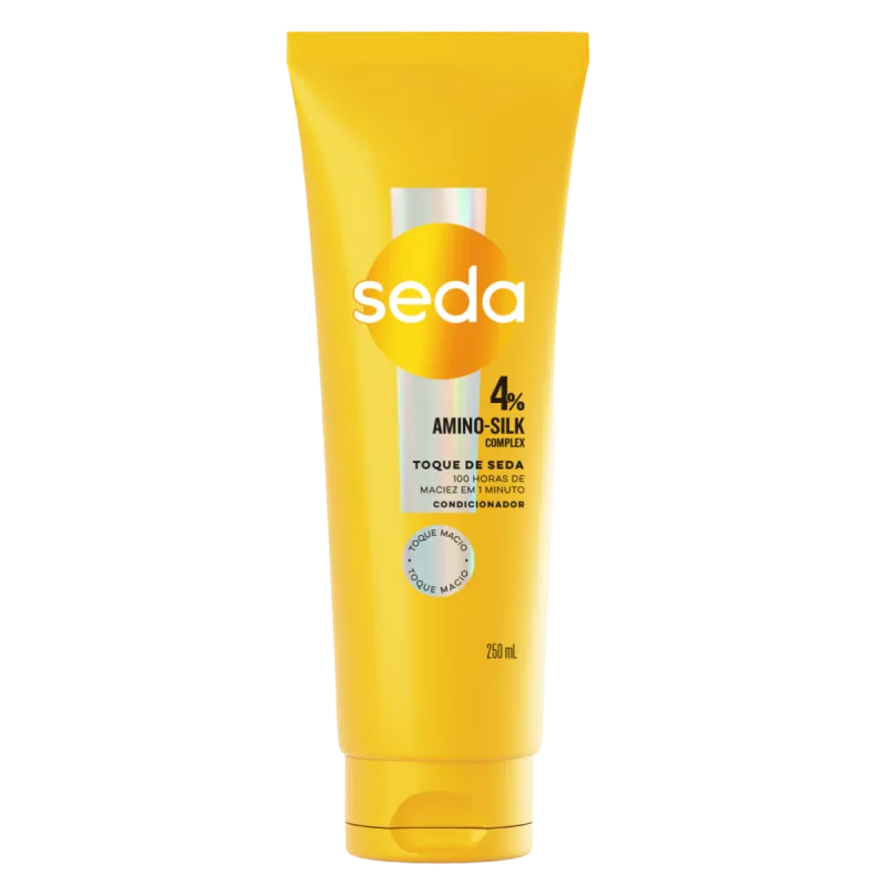O Condicionador Seda Toque de Seda com Amino Silk Complex proporciona cabelos macios e hidratados.