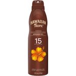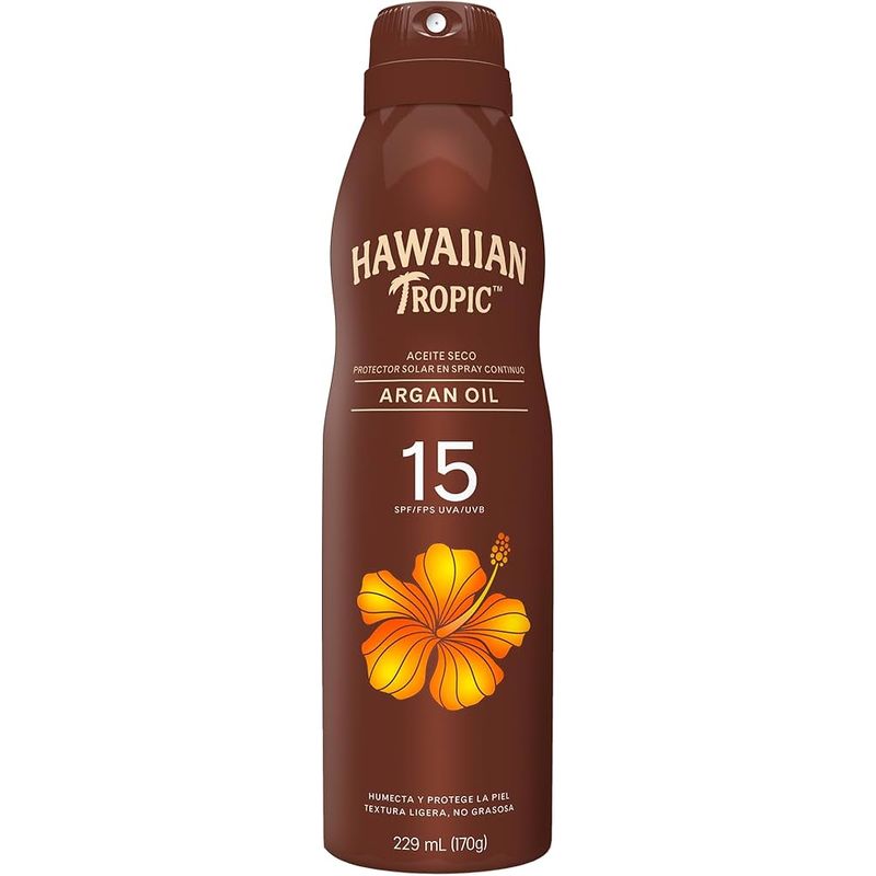 Hawaiian Tropic Aceite Seco é um protetor solar com FPS 15 em spray contínuo e fragrância exclusiva, textura leve e não oleosa com óleos emolientes da árvore de Argan.